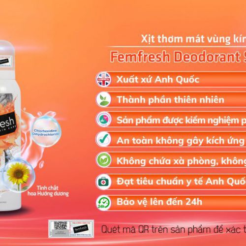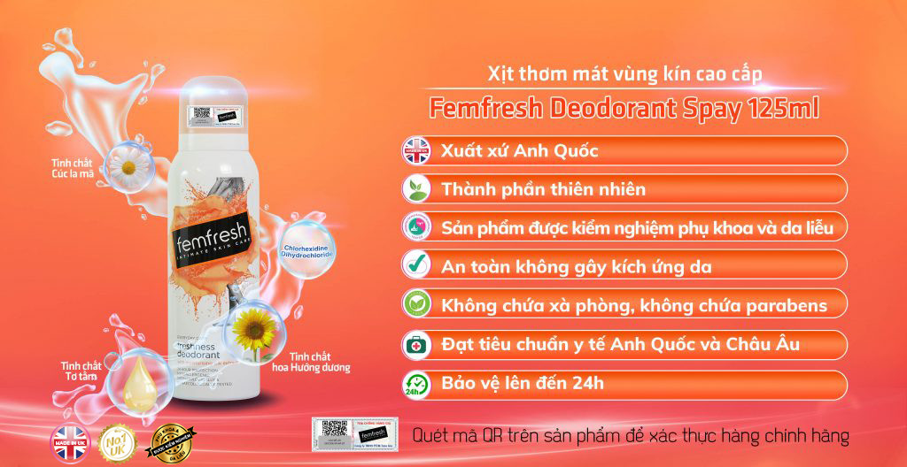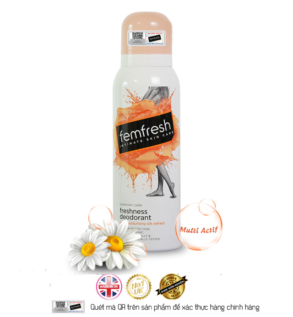 Xịt khử mùi vùng kín cao cấp Femfresh Deodorant Spray được thiết kế đặc biệt giúp hỗ trợ duy trì sự sạch sẽ, thơm mát tự nhiên của vùng kín. Nhờ các thành phần thiên nhiên tinh chất Cúc la mã, tinh chất hoa Hướng dương, chiết xuất lụa giữ ẩm cùng phức hợp Multiacif hỗ trợ khả năng kháng khuẩn, tăng thêm lớp bảo vệ cho vùng kín luôn sạch sẽ, khỏe mạnh, thơm mát, tự tin, tạo cảm giác tươi mới suốt 24h.